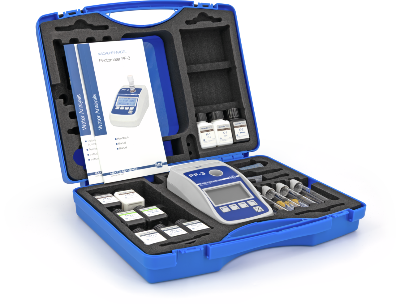 The compact photometer PF‑3 is the smallest member of the MACHEREY‑NAGEL photometer family. The device completes our product portfolio and perfectly fits our tradition of reliability, user friendliness and innovation. The instrument comes in multiple versions, equipped with three LEDs and interference filters, designed to meet the analysis requirements of specific applications. Together with the approved VISOCOLOR ECO test kits, brandnew VISOCOLOR Powder Pillows and high quality NANOCOLOR tube tests from MACHEREY‑NAGEL, the PF‑3 is perfectly suited for mobile analysis directly at the place of sampling. Optionally, the device comes in a practical case with pre-equipped test kits, in a cardboard box or in an empty case for the individual combination with our VISOCOLOR ECO test kits.